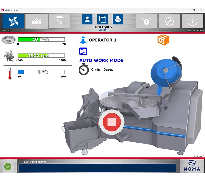 - Integrovaný teploměr díla, ukazatel otáček nožové hlavy, otáček mísy, doby zpracování, číslo šarže.